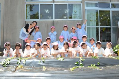 2016年6月2日に幼稚園の裏の畑にて、お芋苗植えを行いました!!こどもたちはサツマイモができる楽しみを感じながら、苗植えを行いました。畑にいる虫たちに興味を示しながら、サツマイモの赤ちゃんを自らの手で植えていました。秋に行う、収穫の際の子どもたちのリアクションがとても楽しみです☆