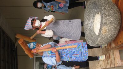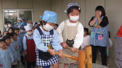 12月9日(金)におもちつきを行いました♫ 初めておもちつきに挑戦する子どもたちが多く、みんなとても楽しそうでした! 杵を持つと「重たい!」と言いながら一生懸命ぺったんぺったん♬♬ ついた後は自分たちでおもちをくるくる丸め、役員さんにきな粉もちにしてもらい、「おいしい~!」と沢山食べていました(^O^)
