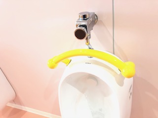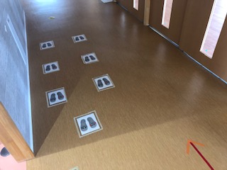・足型とテープが目印、ドアノブには抗菌シートを貼っております。