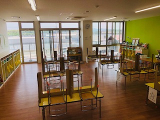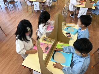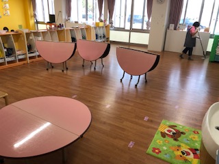 ・机には園児の前後と左右に仕切りをたて、飛沫を予防しています。