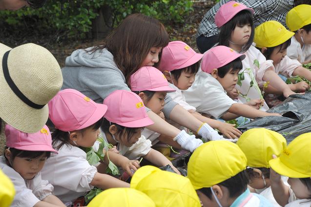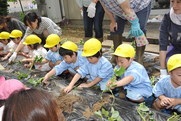 子どもたちは大きなお芋に育つように祈りながら、土をやさしく苗にかけてあげていました。