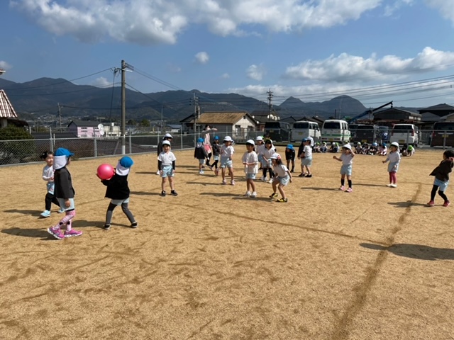 その後、年長組さんの中で流行している”ドッヂボール”をクラス対抗で行いました。