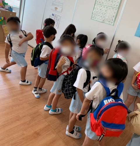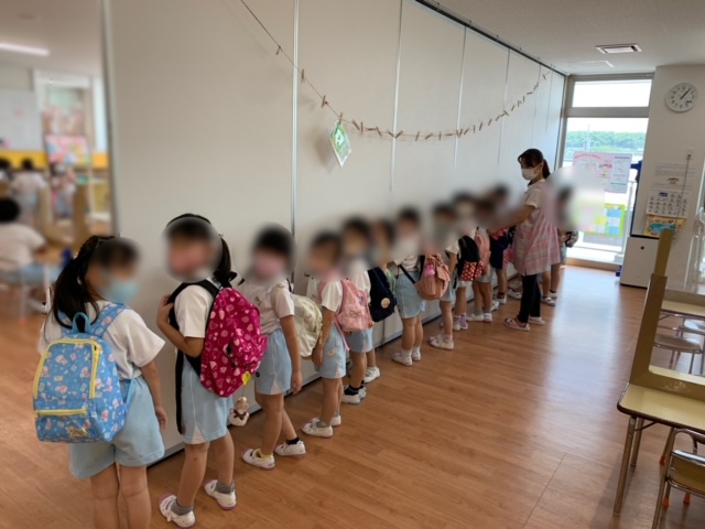 年長児のみ夕涼み会当日は通常保育であり午前中は各クラスにて主活動を行い、昼食を食べたあとは体の休息を図りエネルギーをいっぱい溜めていた子ども達☆おやつを食べたあとは、各グループのバッチをつけ身支度を整えて、そのあと会場のお部屋へ移動しました。