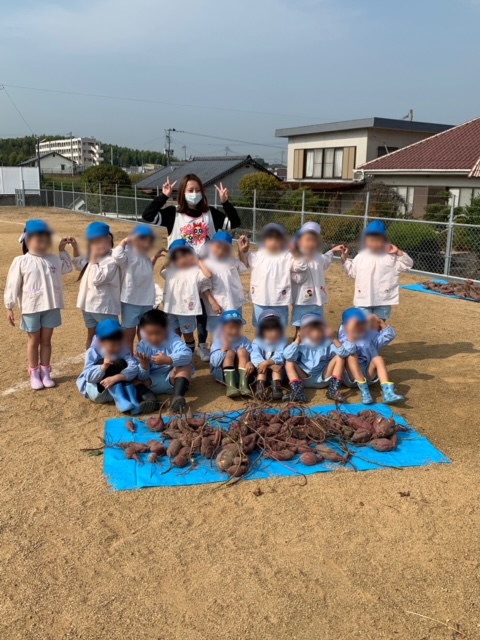 収穫したお芋の前で集合写真も撮りました(*’▽’)